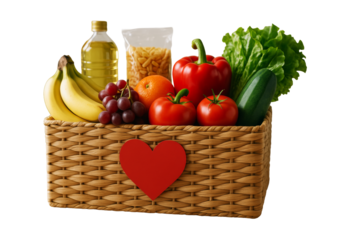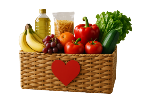 Wicker basket filled with fresh fruits, vegetables, and groceries, isolated on white background, symbolizing food donation and social care. Ai generative