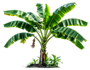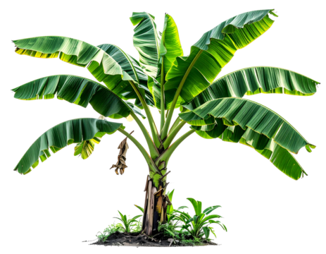 A lush green banana tree, with a large bunch of unripe bananas and a purple banana blossom, cutout, PNG isolated on white or transparent background