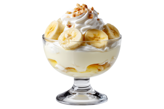 Banana pudding dessert with whipped cream and mint leaves in glass cup, isolated on white transparent background, concept of Papua New Guinea sweet treat