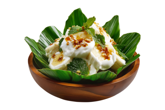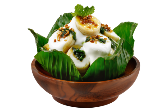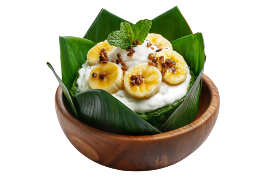Banana pudding dessert with whipped cream in wooden bowl, styled with green leaves, isolated on white transparent background, concept of Papua New Guinea sweet treat