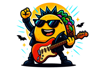 Funny taco cartoon character playing electric guitar with sunglasses in festive celebration art