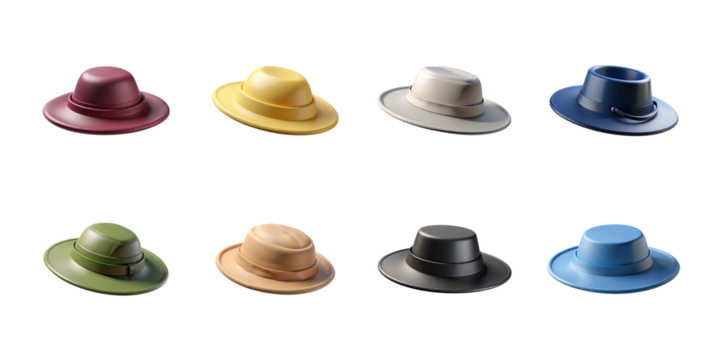 Collection of eight stylized fedora or safari hats rendered in various solid colors isolated on transparent background