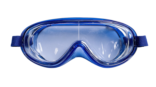Blue-framed goggles, transparent lens, elastic band, isolated against black