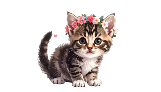 A cute tabby kitten wearing a floral crown, small heart by its tail