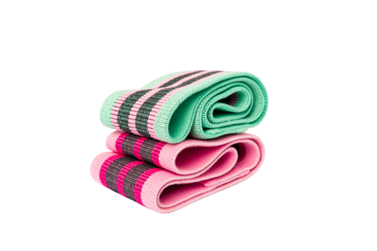 Fitness equipment knee pads, bands, gloves, and a resistance band arranged on black background