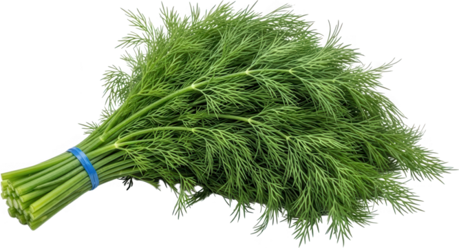 A fresh bunch of bright green dill herb tied with a blue rubber band showcasing its delicate feathery fronds and thick stems food ingredient seasoning transparent background