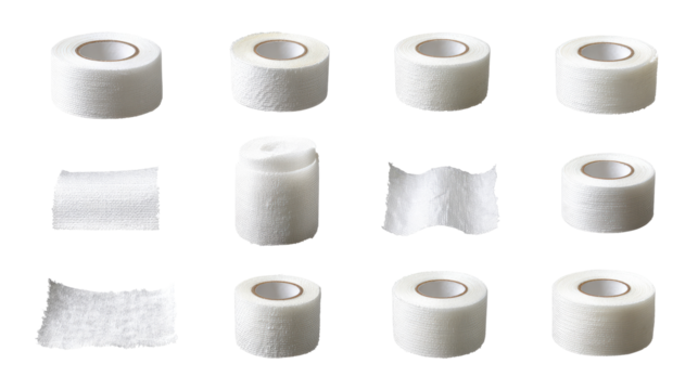 Close up of a bandaged finger with white medical tape, showcasing first aid treatment for injuries on a transparent background, ideal for healthcare and medical visuals