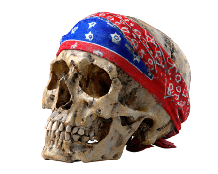 Human skull red bandana blue pattern isolated aged bone patriotic American flag colors eerie Halloween headwear emotional expression of mystery