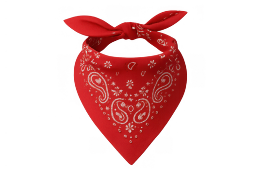 Red paisley bandana with neckerchief knot accessory, classic fashion textile. Western cowboy style, a kerchief cut out on transparent background