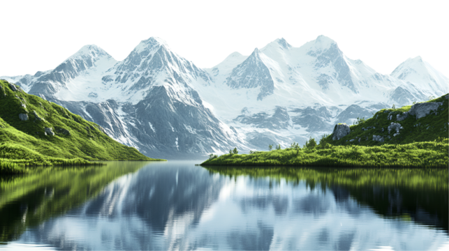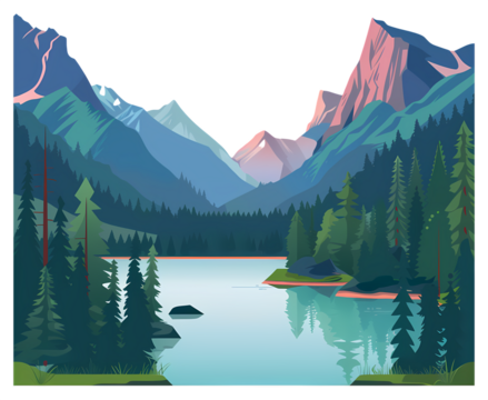 Mountain lake, serene with reflections of pine forests and rocky peaks at dawn, cutout, PNG isolated on white or transparent background