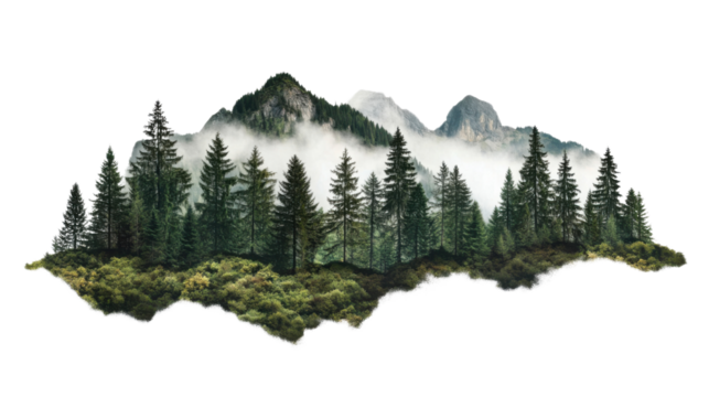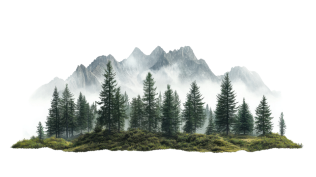 PNG panoramic view of a mountain range with a transparent sky.  The rocky crags are surrounded by green slopes covered in trees.