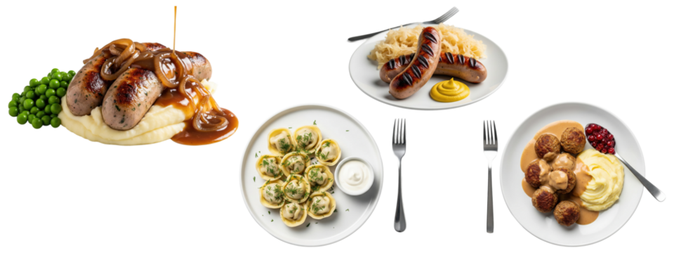 Traditional European meat dishes including bangers and mash, grilled sausages with sauerkraut, ravioli with cream sauce, and Swedish meatballs with mashed potatoes