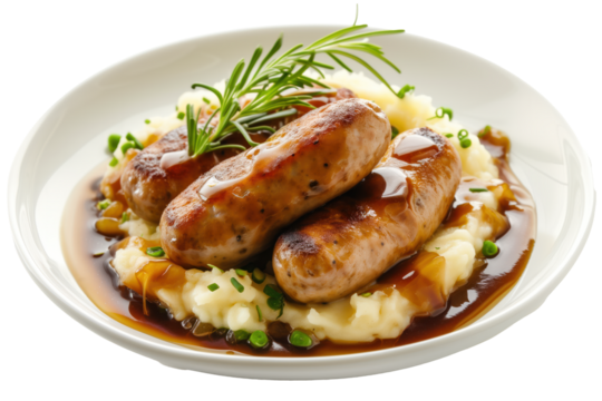 Bangers and mash with grilled sausages on creamy mashed potatoes and rich brown gravy in wooden bowl isolated on transparent background