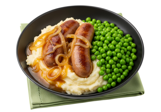 Bangers and Mash - A traditional British dish made with sausages (bangers) and mashed potatoes (mash), usually served with rich