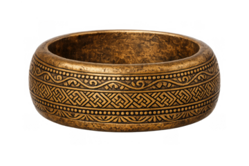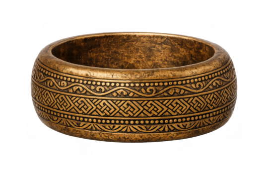 Ornate antique brass bangle bracelet with intricate ethnic patterns, vintage gold jewelry accessory on transparent background
