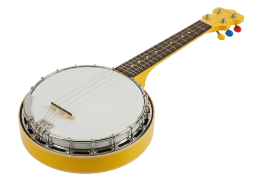 Isolated yellow banjo ukulele, musical instrument of four strings for traditional music
