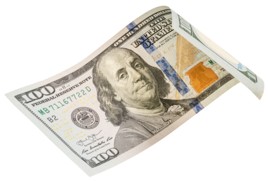 100 dollars banknotes falling in the air isolated on white, Flying 100 American dollars banknotes isolated on white background PNG file.