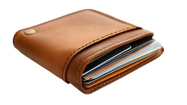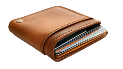 Close up of a brown leather wallet stuffed full of credit cards and identification on transparent background