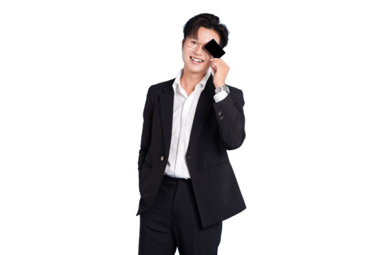 Businessman holding gold credit card on transparent background