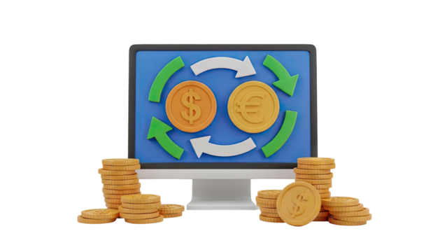 3D Online Currency Exchange Computer Screen with Dollar and Euro Coins on transparent background