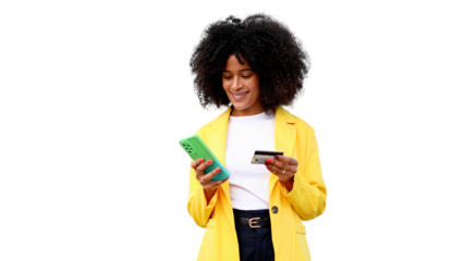 Cheerful businesswoman is using smartphone and credit card for online shopping on transparent background