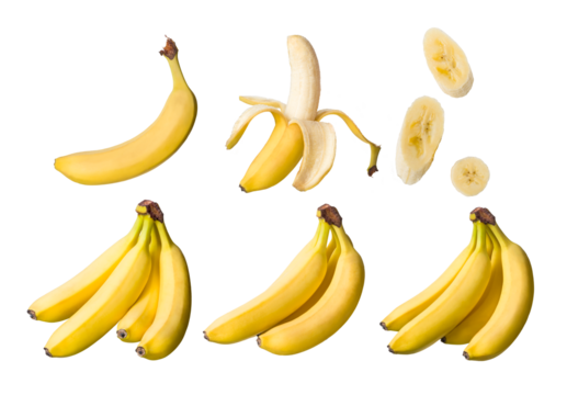 Cacho de bananas e rodelas de banana em fundo transparente - conjunto de banana nanica