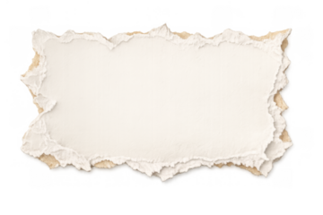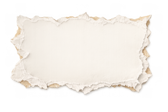 Torn paper and cardboard pieces layering, creating a textured frame or banner with ripped edges. Transparent background