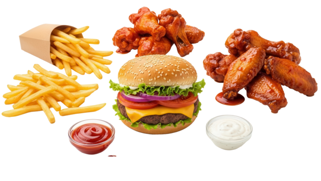 Dynamic composition of a fast food feast with burgers fries and chicken wings isolated on white background