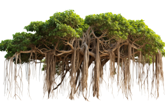 Majestic banyan tree isolated on white background, showcasing its sprawling branches and intricate root structure, perfect for nature-themed projects.