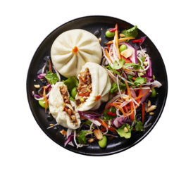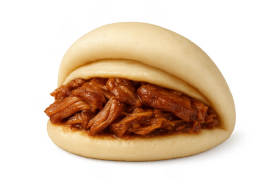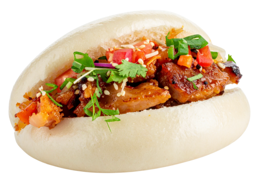 Delicious asian style steamed bao bun filled with tender pulled pork and fresh herbs transparent
