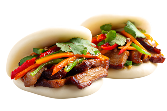 Two delicious bao buns filled with savory meat and fresh vegetables on transparent background