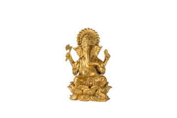 Golden figurine of the Indian god Ganesh also known as Ganpati or Vinayaka. Symbol of wisdom, abundance and the ability to remove obstacles and problems. Transparent background