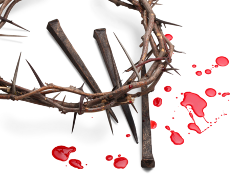 Bloody crown of thorns on the desk. Good Friday, Passion of Jesus Christ. Christian Easter holiday.