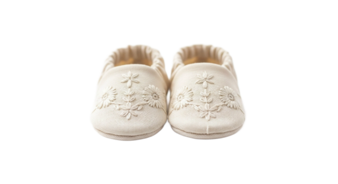 Pair of creamcolored fabric baby shoes with delicate monochromatic floral embroidery. PNG Transparent