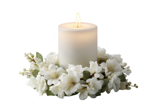 A lit white candle surrounded by delicate white flowers creates a serene and elegant centerpiece perfect for ceremonies transparent background