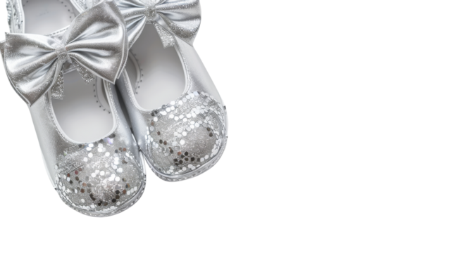 Silver Baby Shoes with Bow and Glitter Detail Isolated on White Background