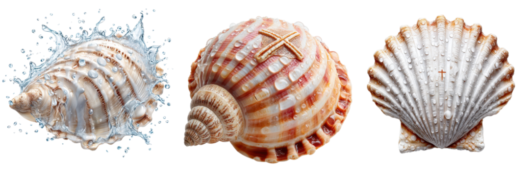 Baptismal shell with water droplets and cross design, Concept of cleansing, rebirth, and spiritual initiation, isolated on Transparent background