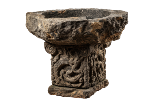 Ancient weathered stone baptismal font with ornate carvings isolated.