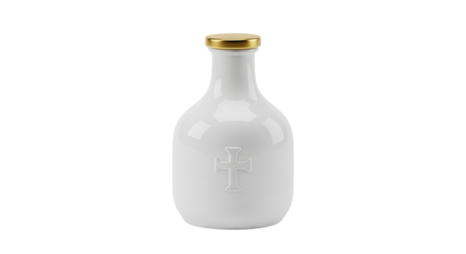 Isolated holy water bottle with a cross and a gold lid for religious ceremonies.