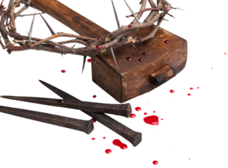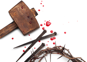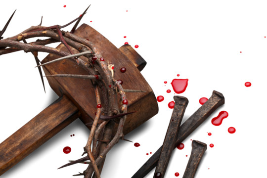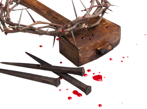 Jesus Christ - Cross With  wooden Hammer and Bloody Nails And Crown Of Thorns