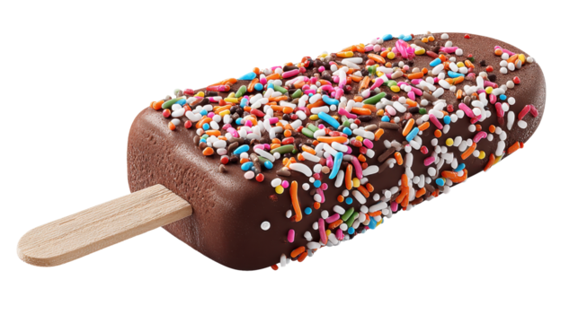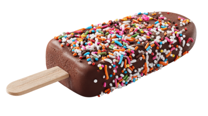 Chocolate coated ice cream bar on a wooden stick, topped with colorful sprinkles  creamy frozen treat evoking summer indulgence and playful sweet nostalgia, isolated on transparent background