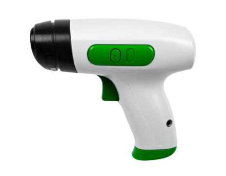 Angled Side Perspective of Barcode Scanner with Illuminated Green Button, Isolated