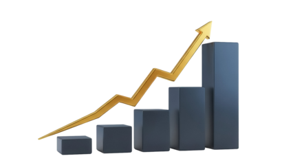 3D Bar graph with an upward trending arrow on transparent background