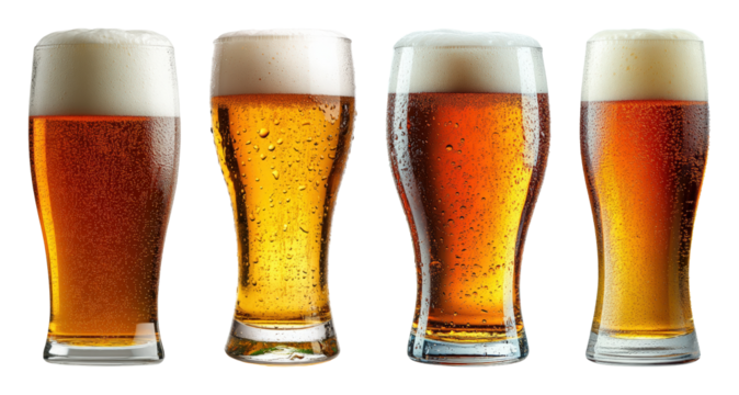 Four tall glasses filled with amber beer topped with frothy white foam condensation droplets on the glass transparent background
