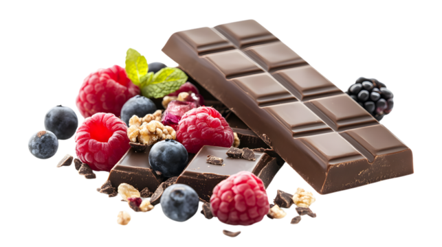 A chocolate bar with berries and mint is on top of a white background. Concept of indulgence and relaxation, as the combination of chocolate and fruit creates a visually appealing and appetizing scene