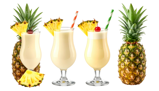 Tropical cocktail scene pineapples, drinks in stemmed glasses, slices, cherries, straws