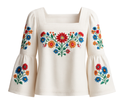 Light blue peasant blouse with lace detail and bell sleeves, women's fashion top cut out on transparent background
