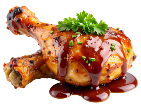 Grilled Chicken Leg with BBQ Sauce Drizzle and Herbs, Side View, Transparent PNG