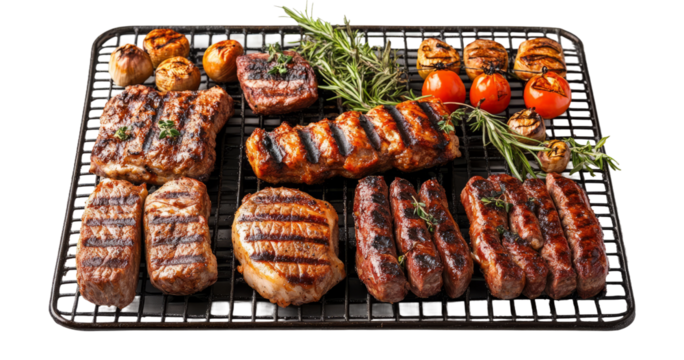 Grilled Meat and Vegetables on Barbecue Rack Garnished with Herbs