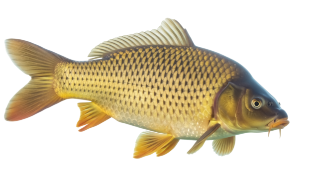 Golden carp PNG isolated on transparent background, freshwater fish with scales and barbels, popular in aquaculture and angling